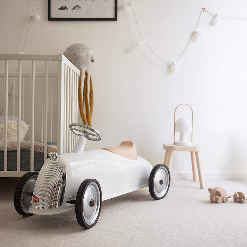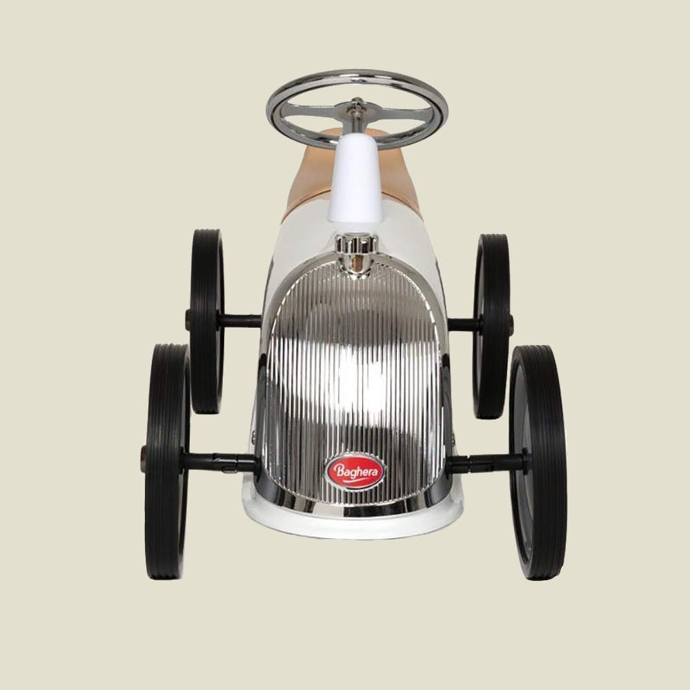 Deze stijlvolle Baghera sneeuwwitte loopauto is een stoere retro loopauto met een mooie gestroomlijnde uitstraling.