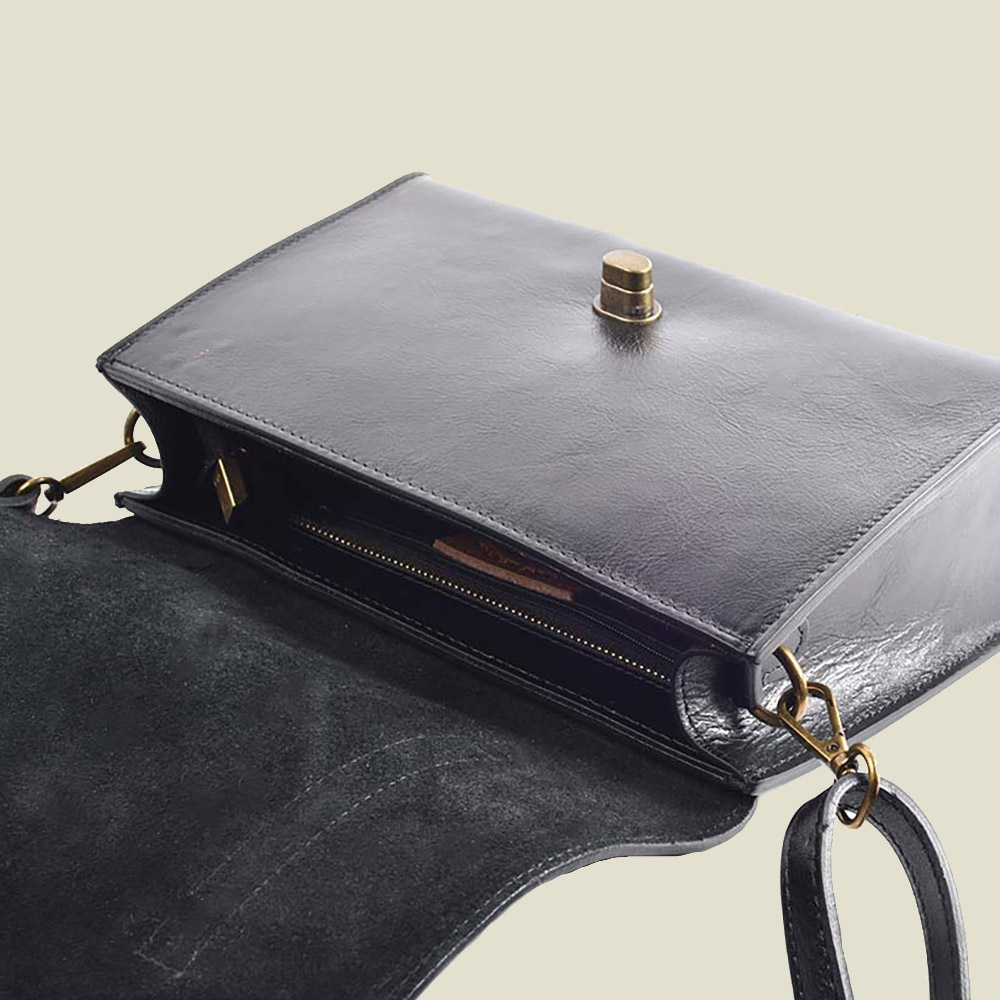 De binnenkant bevat een groot vak en een kleiner vakje met rits.
